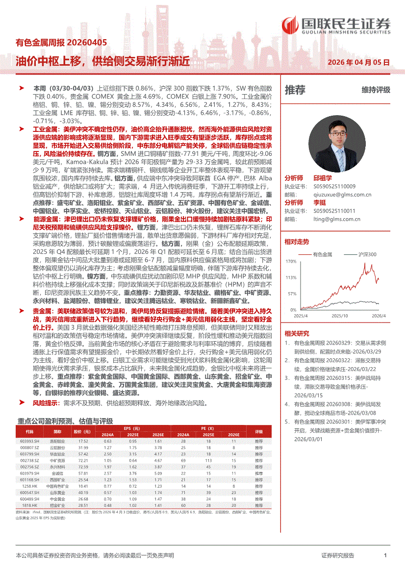 有色金属行业:国联民生证券-有色金属行业周报:油价中枢上移,供给侧交易渐行渐近-260405