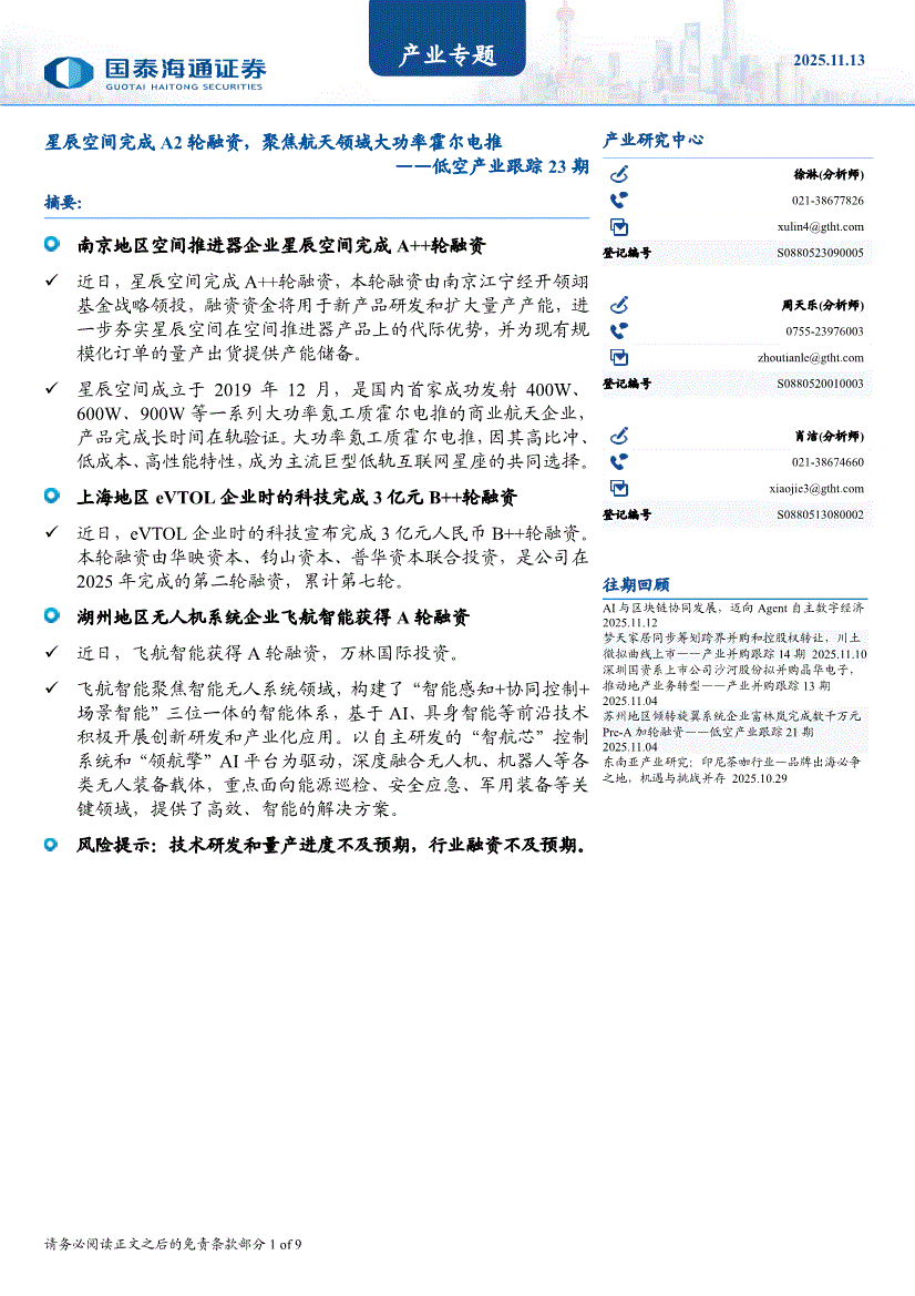 国泰海通证券-产业专题:低空产业跟踪23期,星辰空间完成A2轮融资,聚焦航天领域大功率霍尔电推-251113