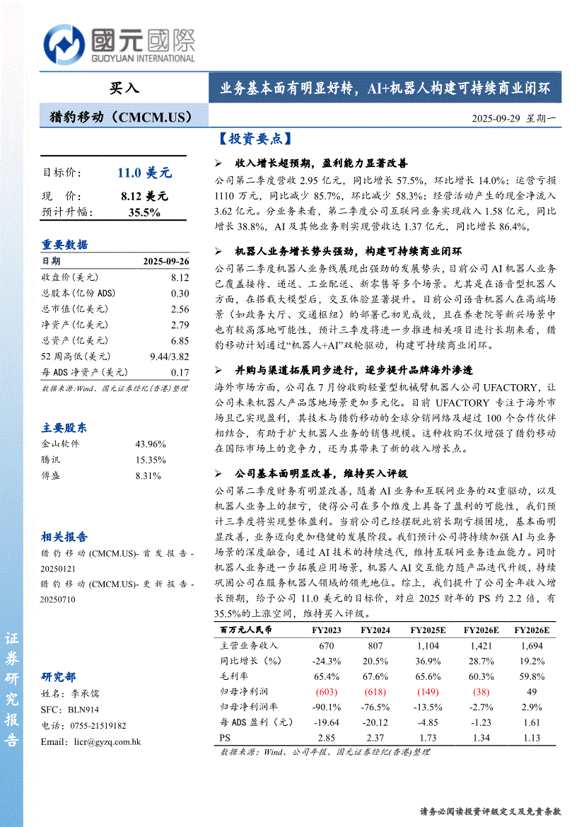 猎豹移动:国元国际-猎豹移动-CMCM.US-业务基本面有明显好转,AI+机器人构建可持续商业闭环-250929