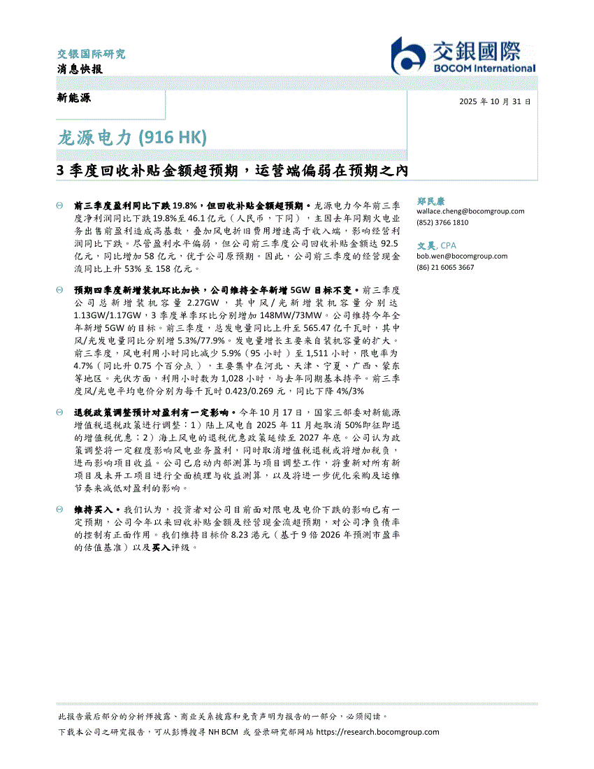 龙源电力:交银国际-龙源电力-0916.HK-3季度回收补贴金额超预期,运营端偏弱在预期之内-251031