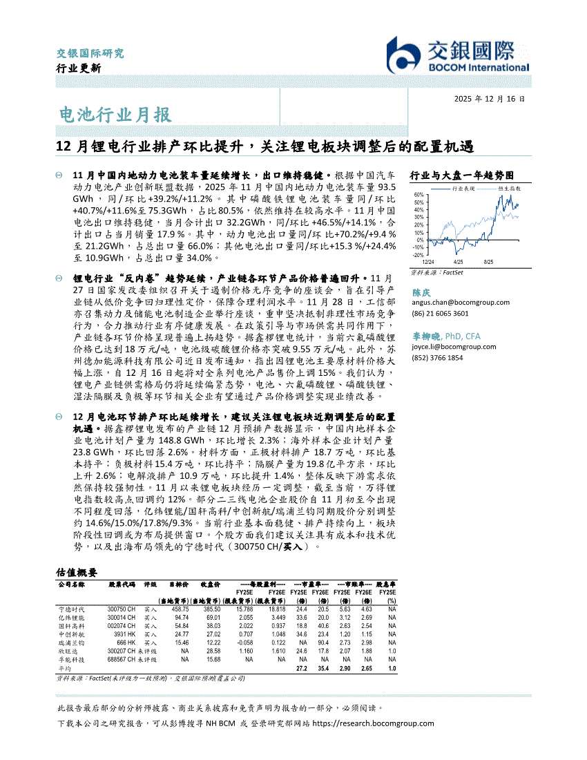 电池行业:交银国际-电池行业月报:12月锂电行业排产环比提升,关注锂电板块调整后的配置机遇-251216