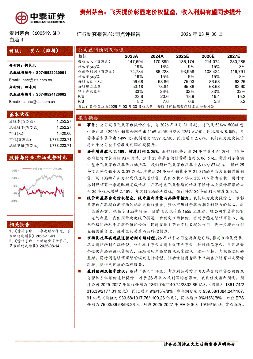 贵州茅台:中泰证券-贵州茅台-600519-飞天提价彰显定价权壁垒,收入利润有望同步提升-260330