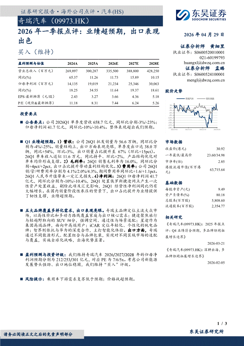 奇瑞汽车:东吴证券-奇瑞汽车-9973.HK-2026年一季报点评:业绩超预期,出口表现出色-260429