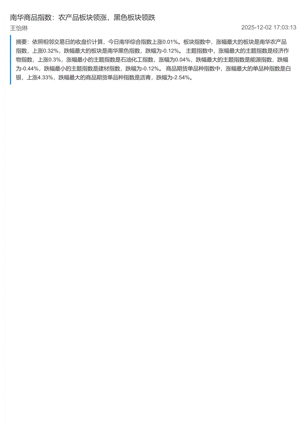 南华期货-商品指数:农产品板块领涨,黑色板块领跌-251202