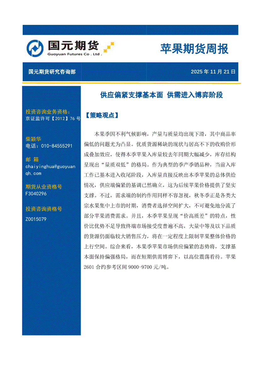 国元期货-苹果期货周报:供应偏紧支撑基本面,供需进入博弈阶段-251121