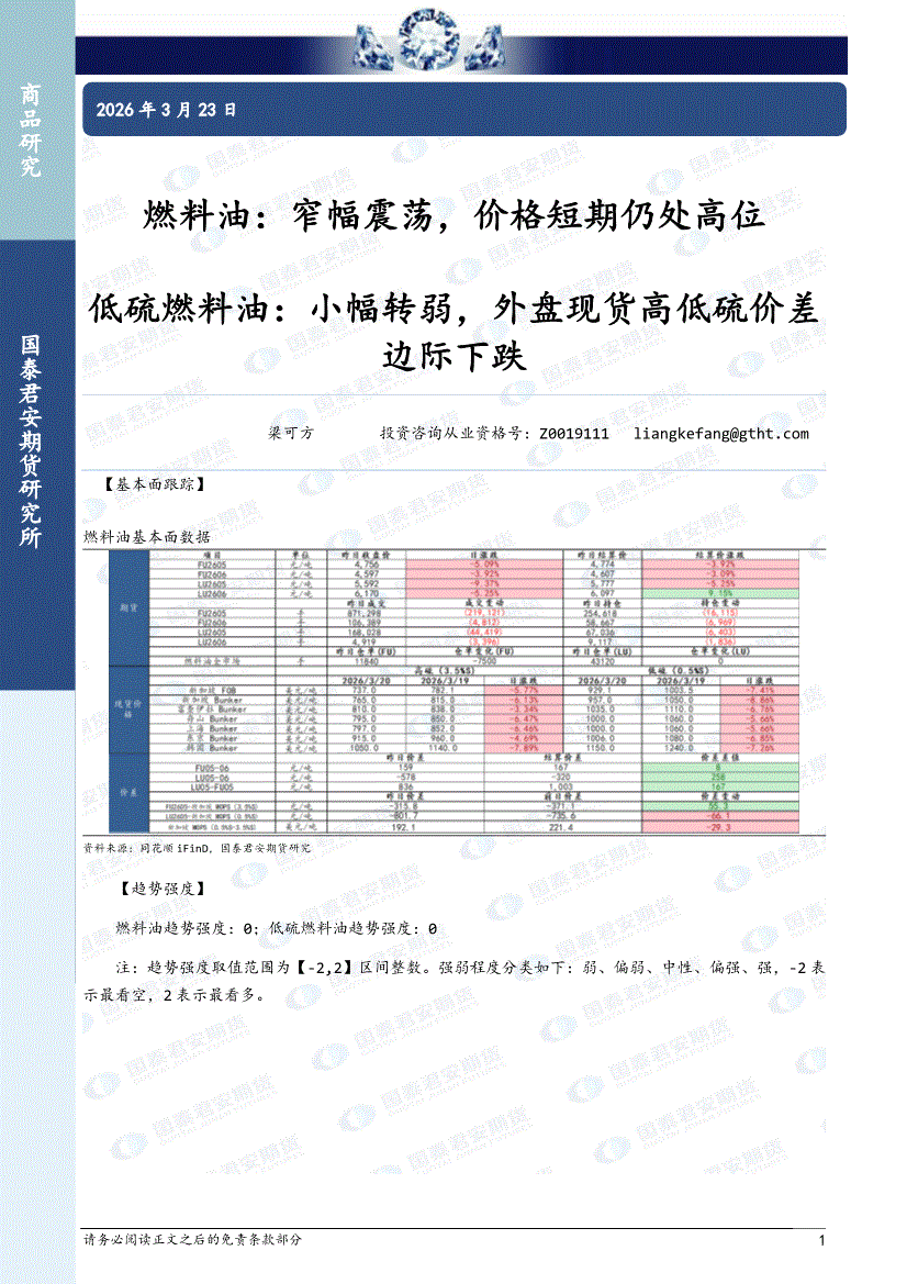 国泰君安期货-燃料油:窄幅震荡,价格短期仍处高位,低硫燃料油,小幅转弱,外盘现货高低硫价差边际下跌-260323