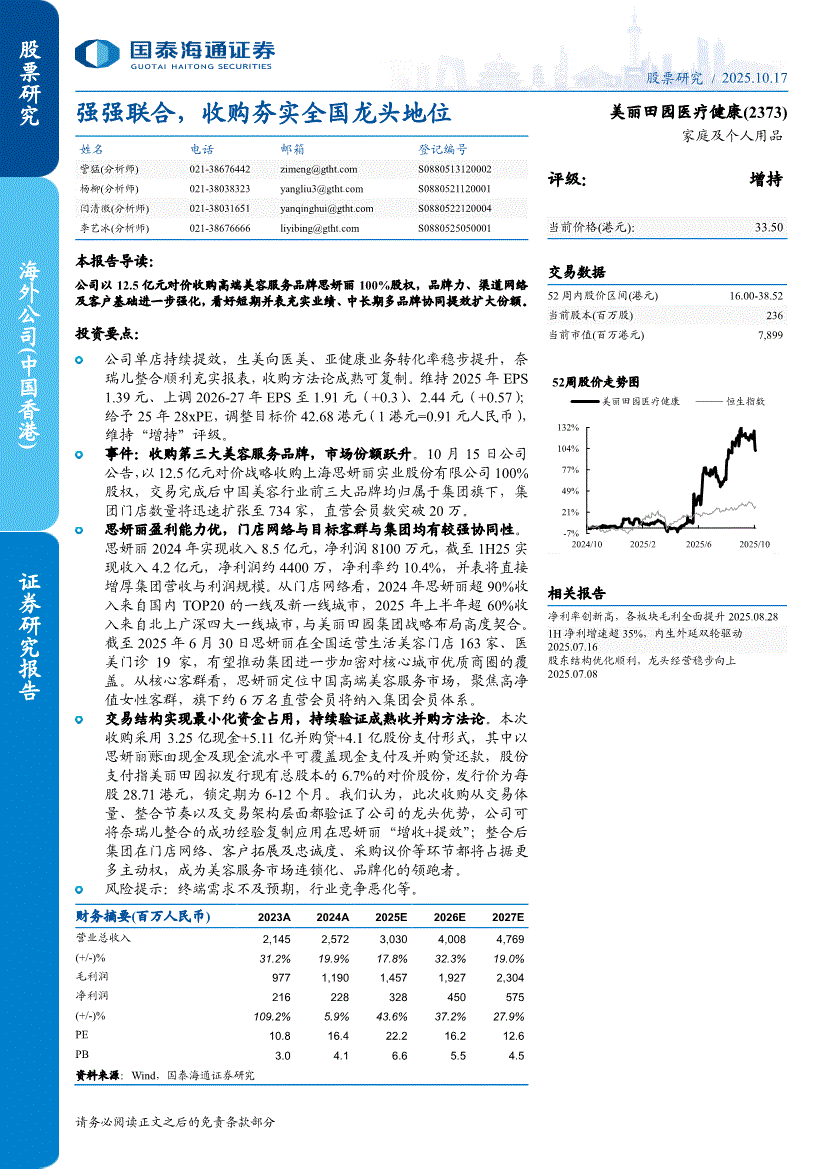 美丽田园医疗健康:国泰海通证券-美丽田园医疗健康-2373.HK-强强联合,收购夯实全国龙头地位-251017