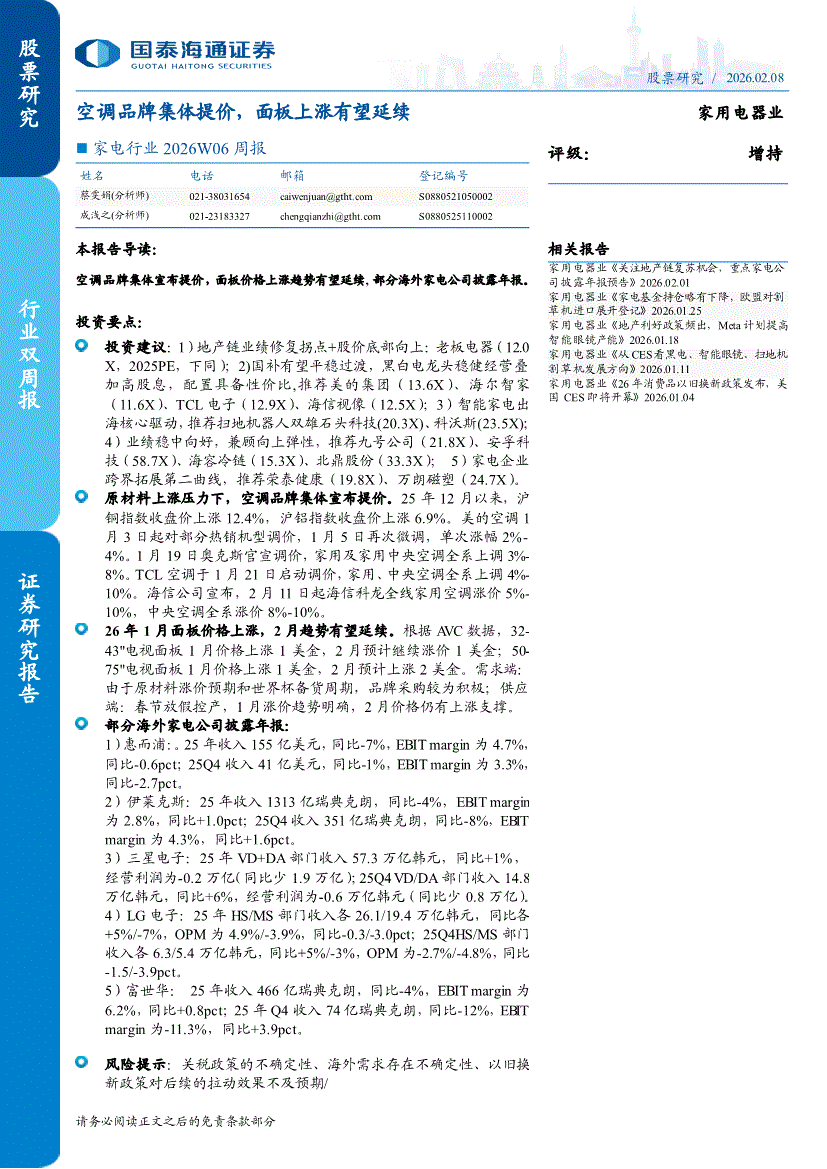 家电行业:国泰海通证券-家电行业2026W06周报:空调品牌集体提价,面板上涨有望延续-260208