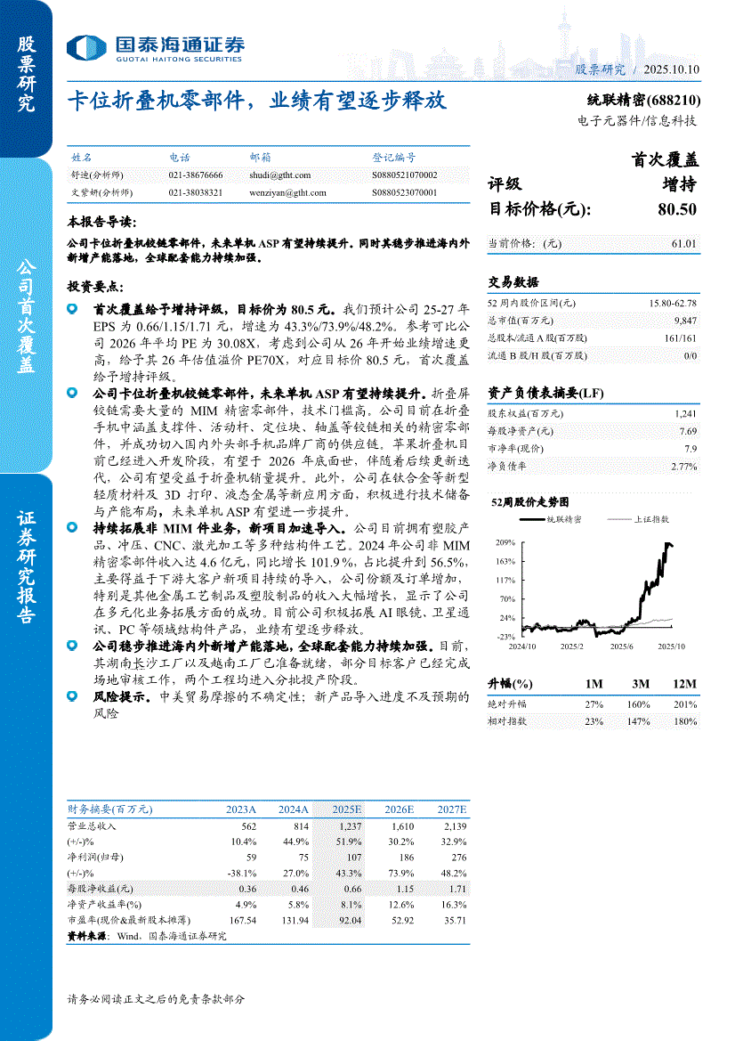 国泰海通证券-统联精密-688210-卡位折叠机零部件,业绩有望逐步释放-251010