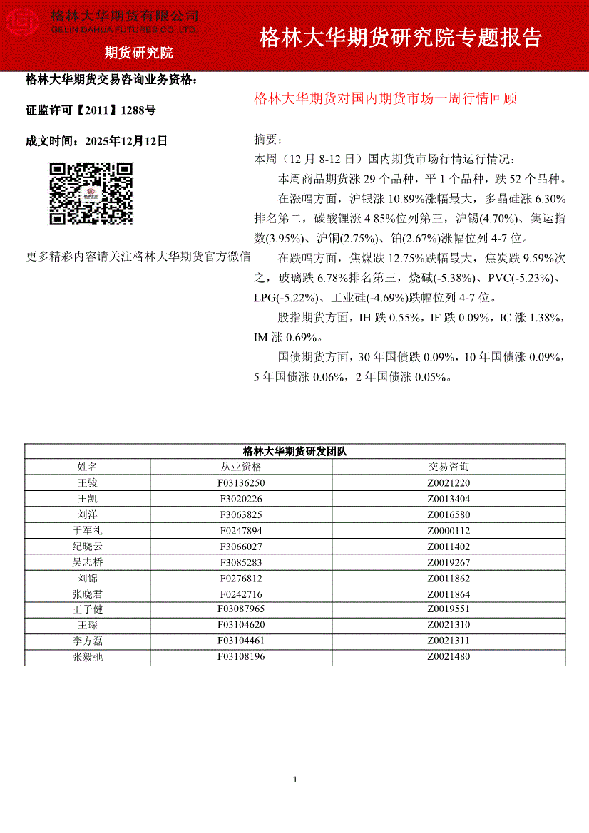 格林大华期货-格林大华期货对国内期货市场一周行情回顾-251212