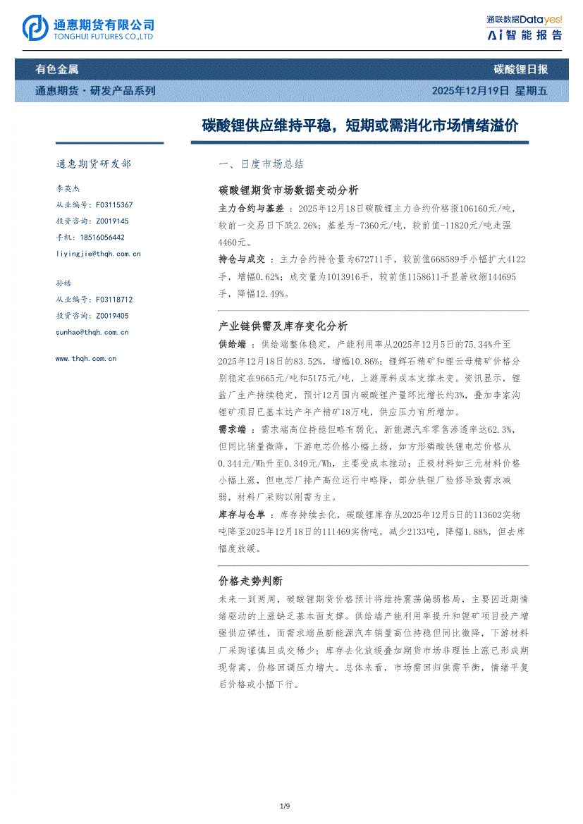 通惠期货-碳酸锂日报:碳酸锂供应维持平稳,短期或需消化市场情绪溢价-251219