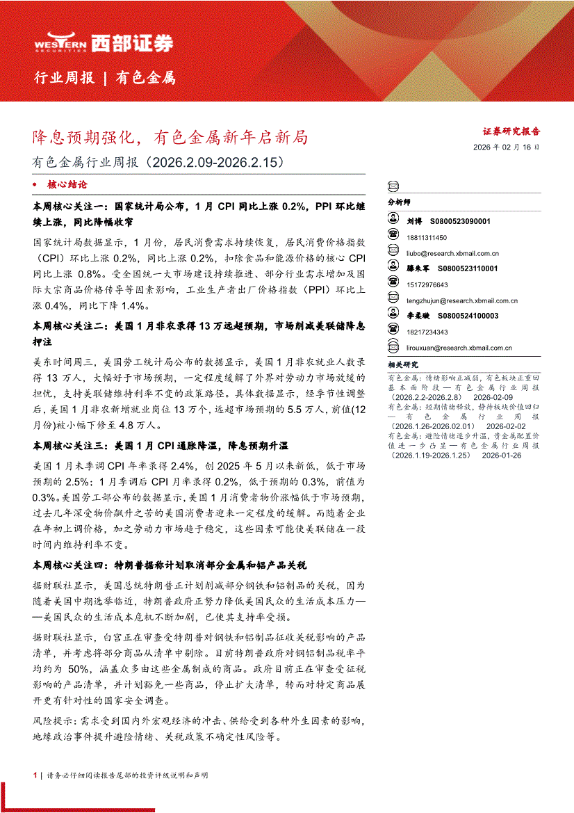有色金属行业:西部证券-有色金属行业周报:降息预期强化,有色金属新年启新局-260216