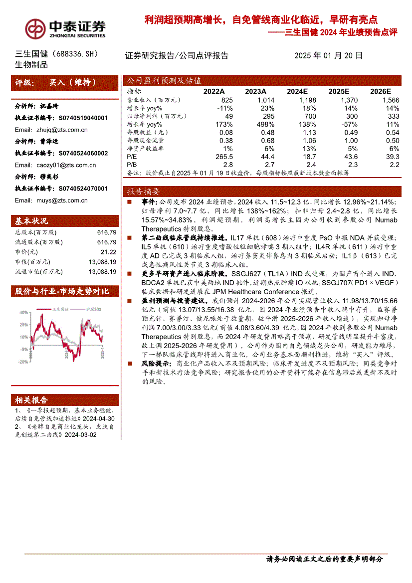 三生国健:中泰证券-三生国健-688336-2024年业绩预告点评:利润超预期高增长,自免管线商业化临近,早研有亮点-250120