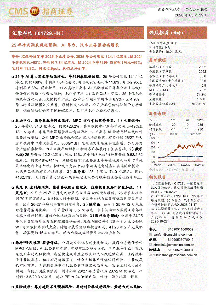 汇聚科技:招商证券-汇聚科技-1729.HK-25年净利润表现超预期,AI算力、汽车业务驱动高增长-260329