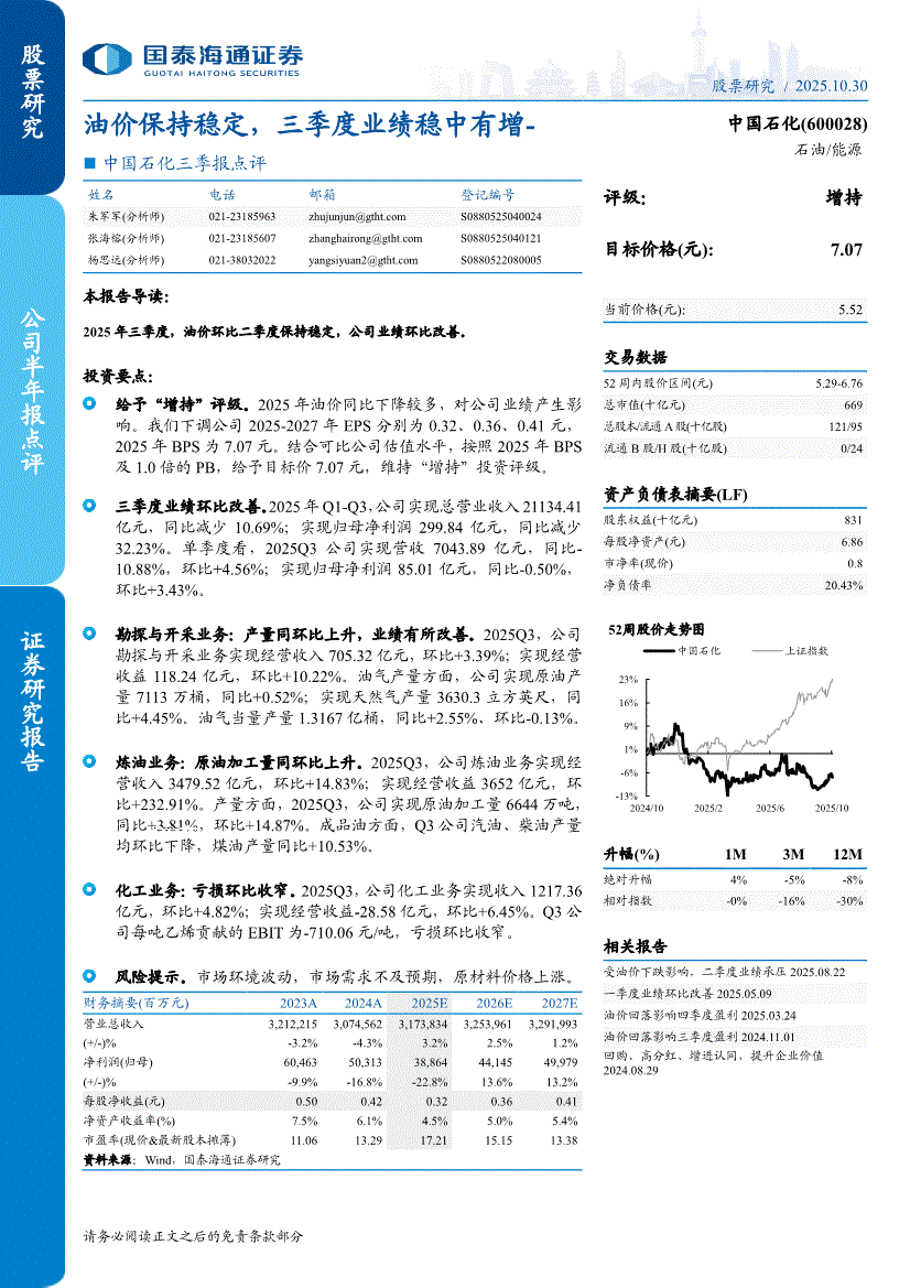 中国石化:国泰海通证券-中国石化-600028-三季报点评:油价保持稳定,三季度业绩稳中有增-251030