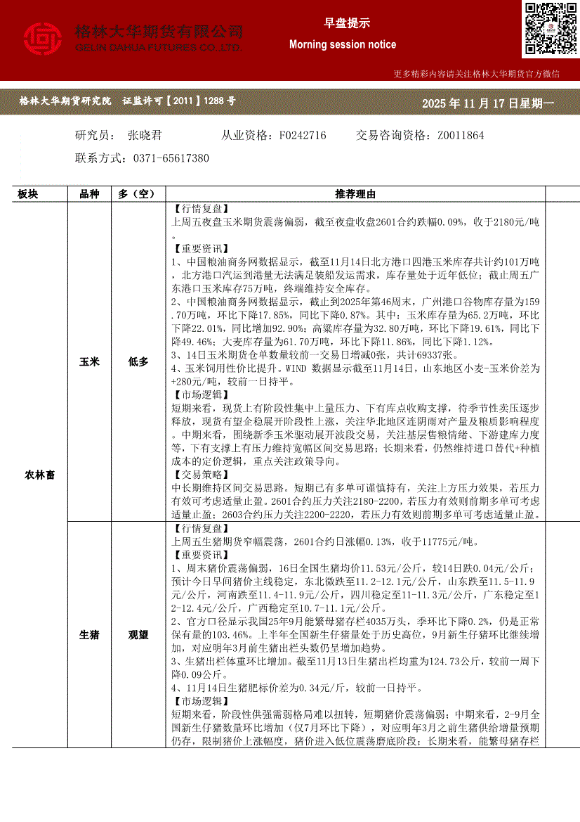 格林大华期货-早盘提示:玉米生猪鸡蛋-251117