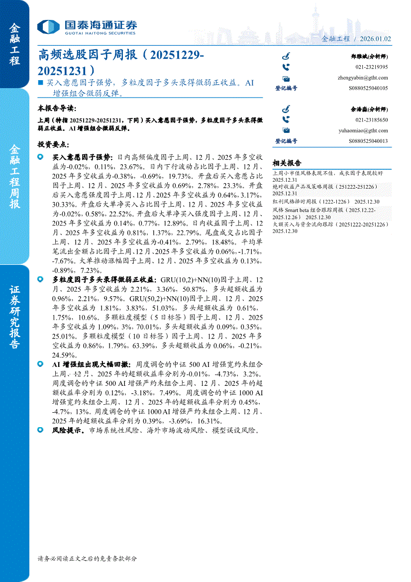 国泰海通证券-高频选股因子周报:买入意愿因子强势,多粒度因子多头录得微弱正收益。AI增强组合微弱反弹-260102