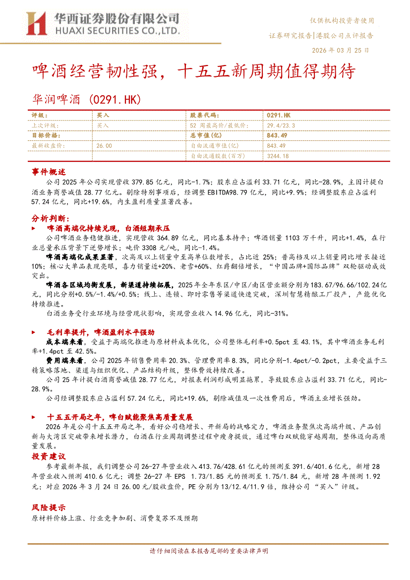华润啤酒:华西证券-华润啤酒-0291.HK-啤酒经营韧性强,十五五新周期值得期待-260325