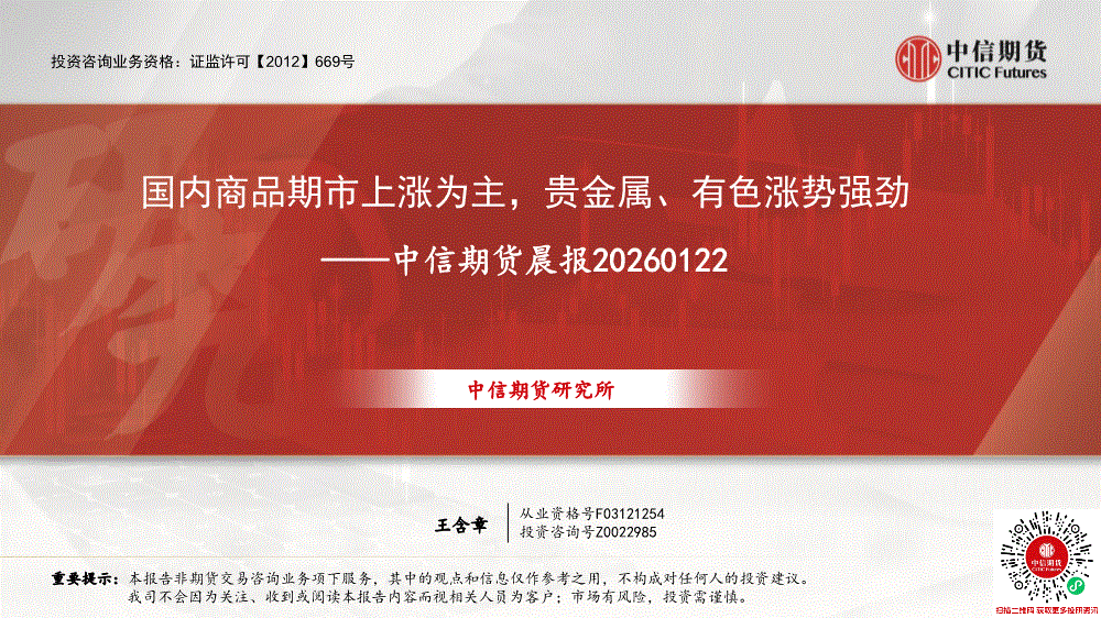 中信期货-晨报:国内商品期市上涨为主,贵金属、有色涨势强劲-260122