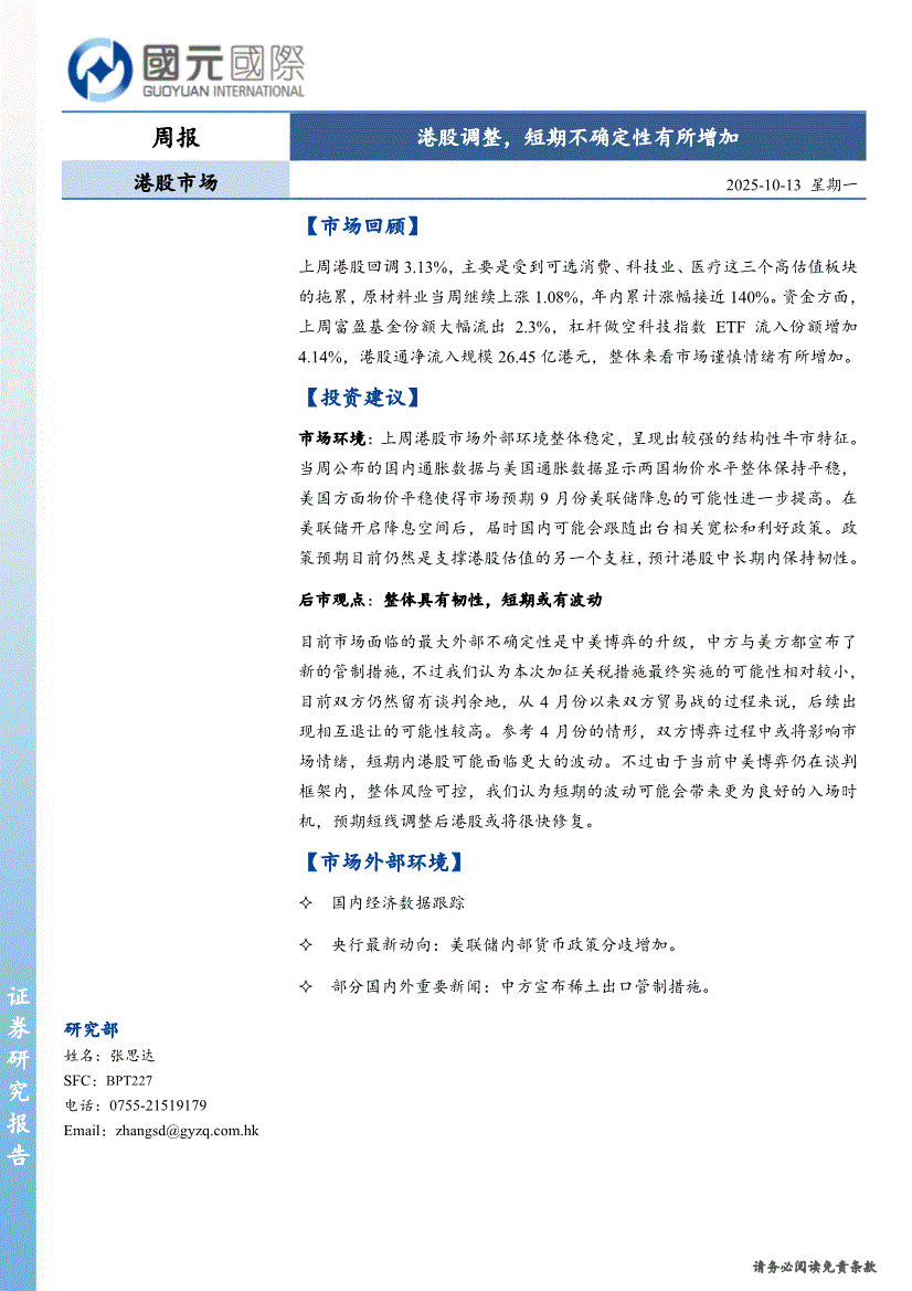 国元国际-港股市场周报:港股调整,短期不确定性有所增加-251013