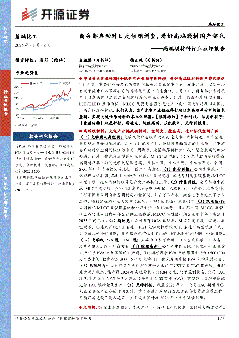 基础化工行业:开源证券-高端膜材料行业点评报告:商务部启动对日反倾销调查,看好高端膜材国产替代-260108