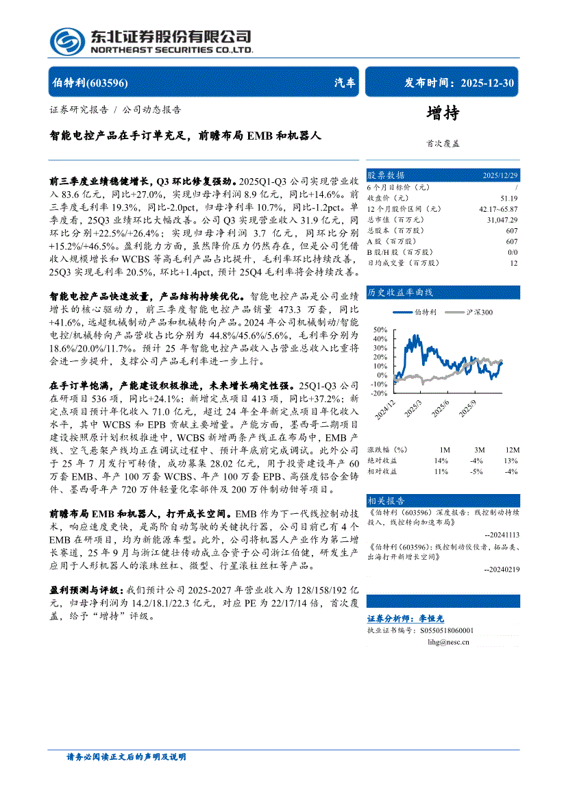 伯特利:东北证券-伯特利-603596-智能电控产品在手订单充足,前瞻布局EMB和机器人-251230