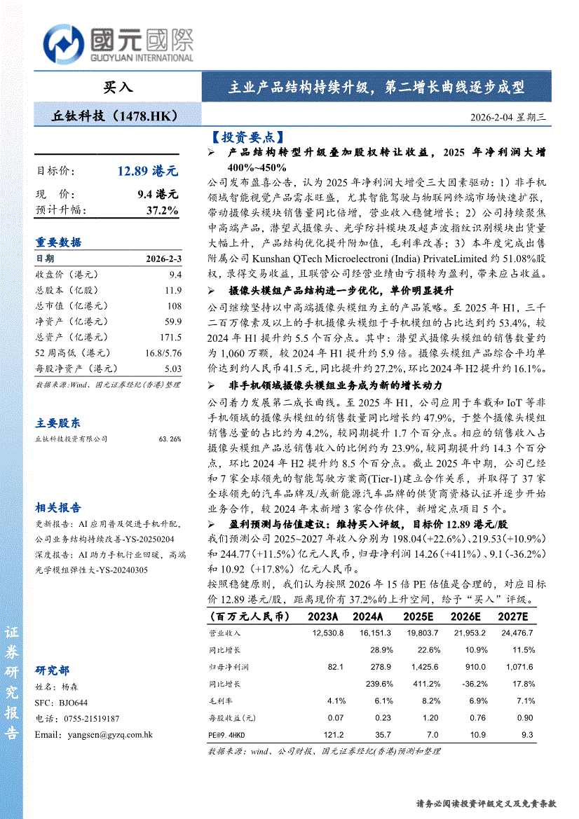 丘钛科技:国元国际-丘钛科技-1478.HK-主业产品结构持续升级,第二增长曲线逐步成型-260204