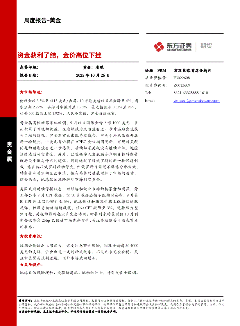 东证期货-黄金周度报告:资金获利了结,金价高位下挫-251026