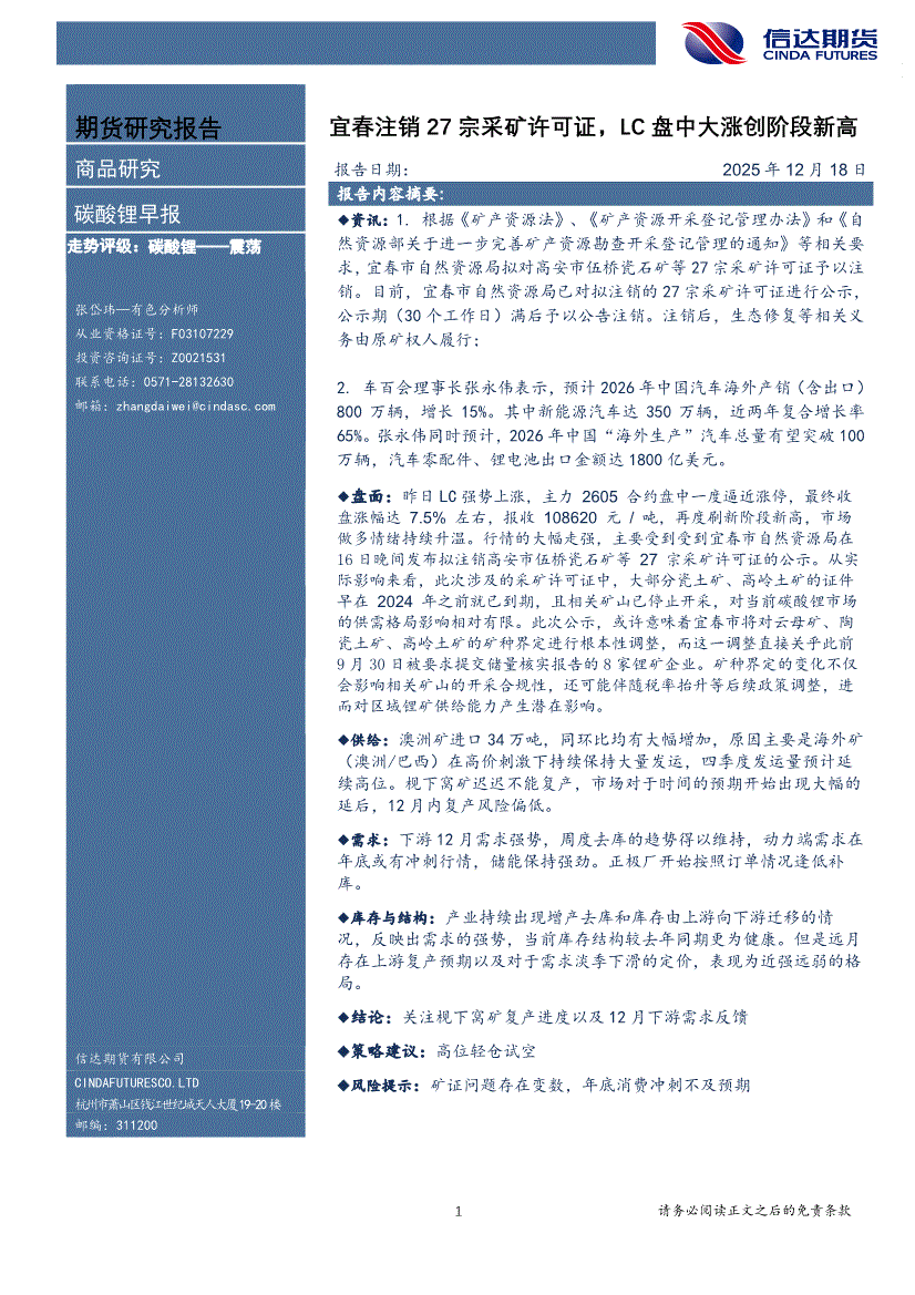 信达期货-碳酸锂早报:宜春注销27宗采矿许可证,LC盘中大涨创阶段新高-251218