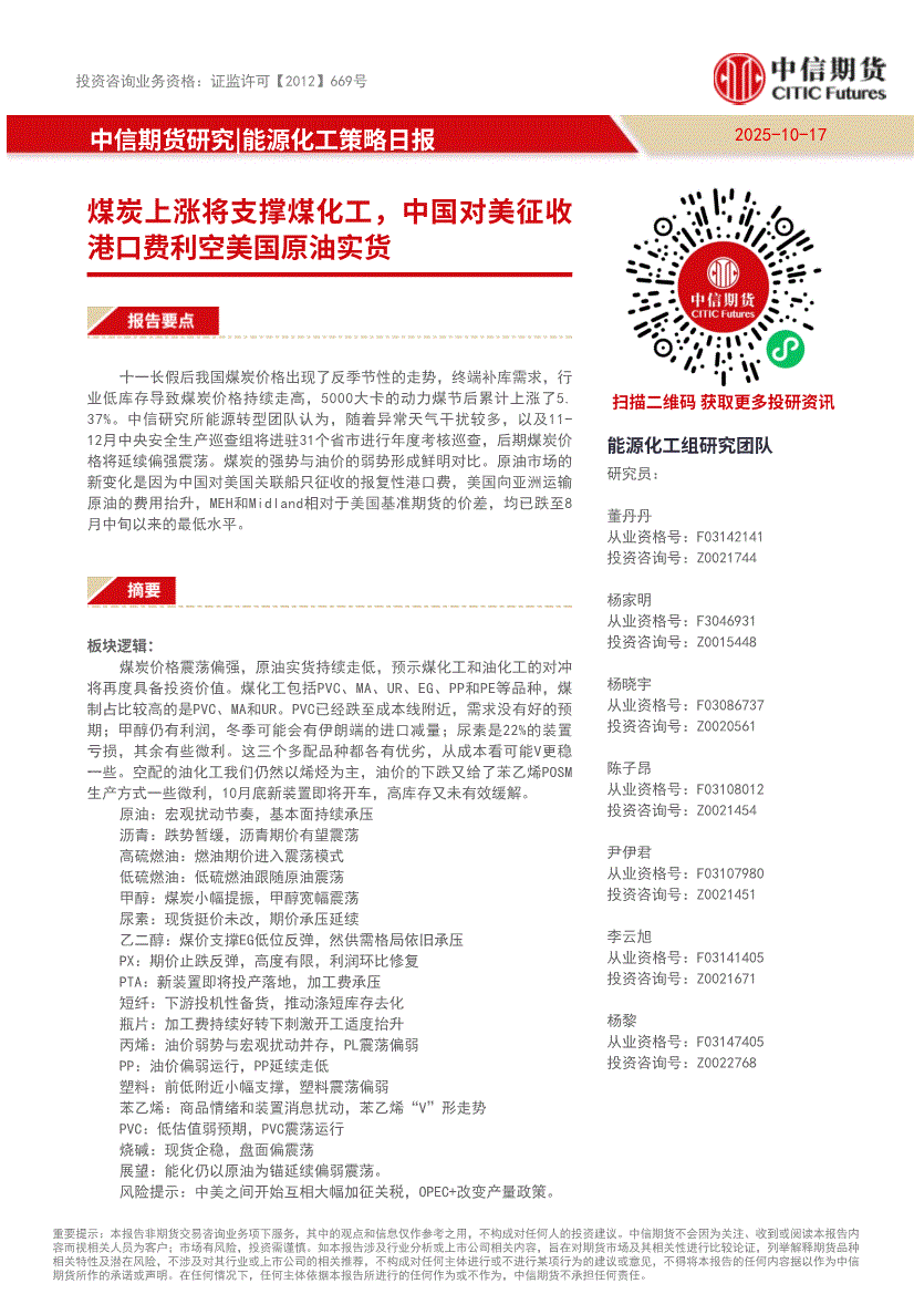 中信期货-能源化工策略日报:煤炭上涨将支撑煤化工,中国对美征收港口费利空美国原油实货-251017