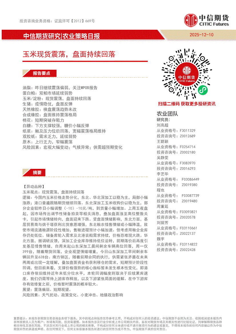 中信期货-农业策略日报:玉米现货震荡,盘面持续回落-251210