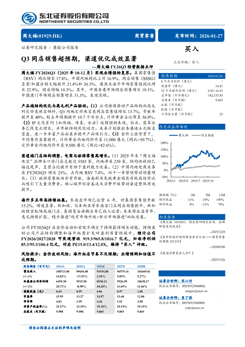 周大福:东北证券-周大福-1929.HK-FY26Q3经营数据点评:Q3同店销售超预期,渠道优化成效显著-260127