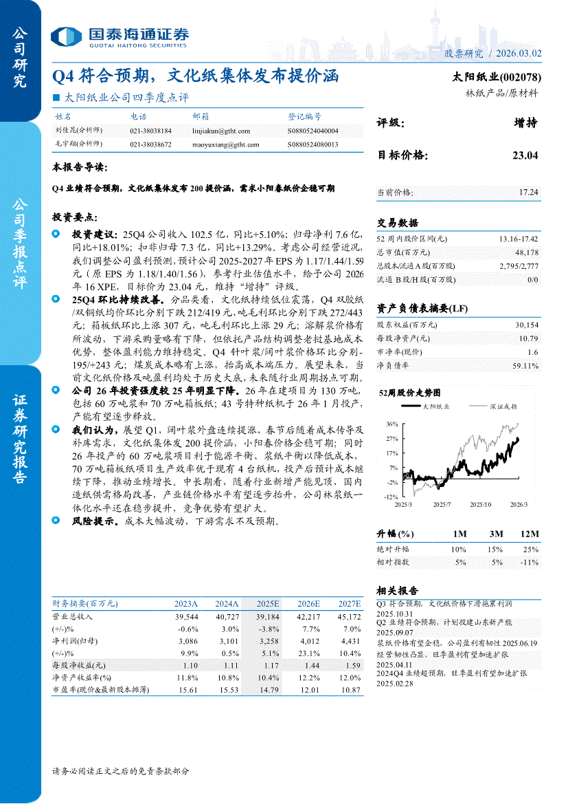 太阳纸业:国泰海通证券-太阳纸业-002078-公司四季度点评:Q4符合预期,文化纸集体发布提价涵-260302