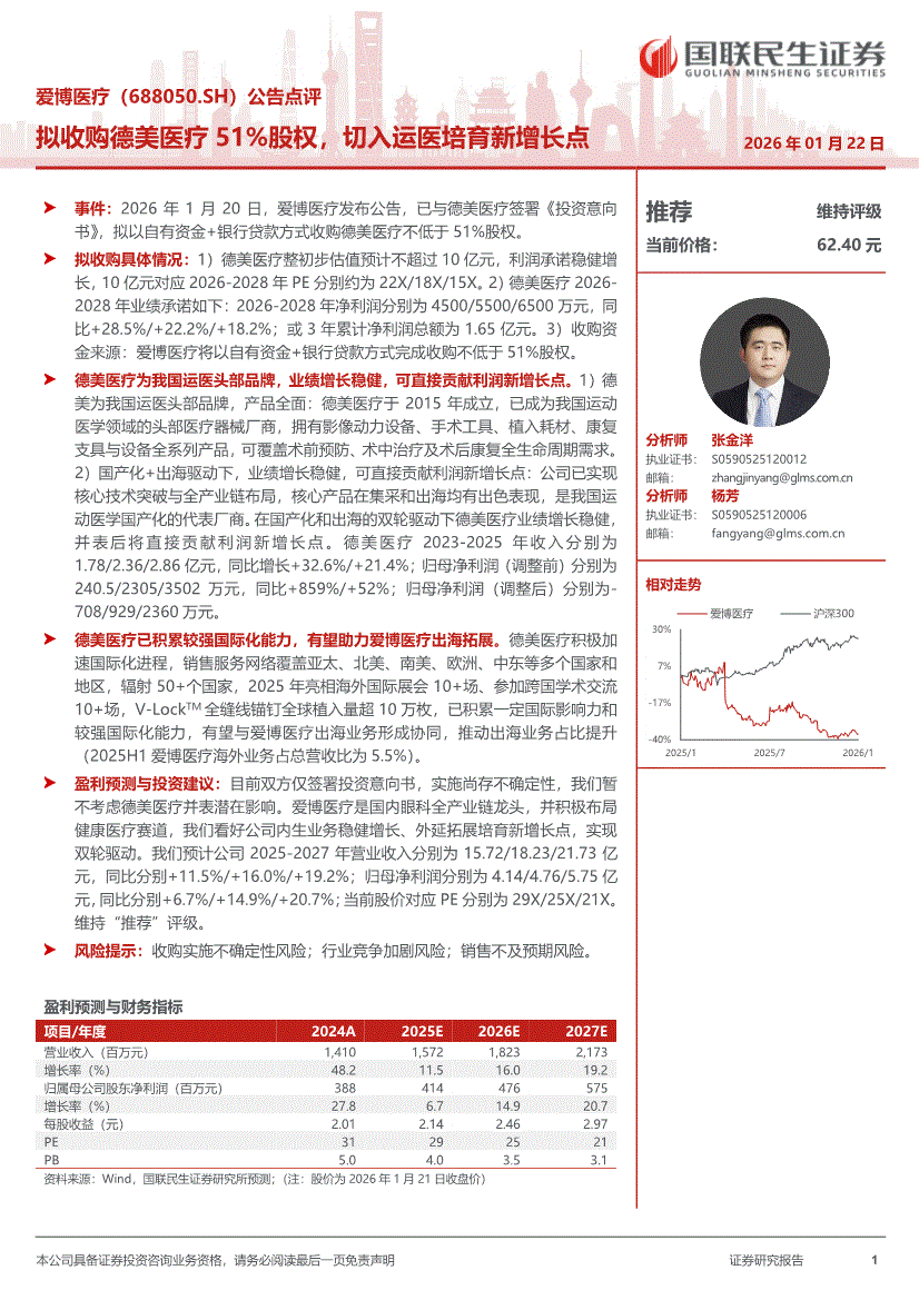 爱博医疗:国联民生证券-爱博医疗-688050-公告点评:拟收购德美医疗51%股权,切入运医培育新增长点-260122