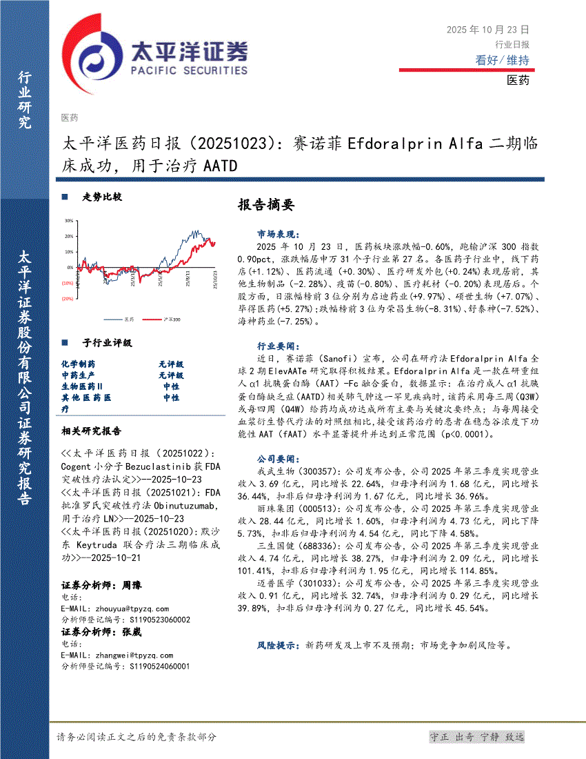 医药行业:太平洋证券-医药行业日报:赛诺菲Efdoralprin Alfa二期临床成功,用于治疗AATD-251023