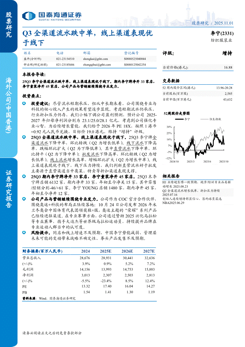 李宁:国泰海通证券-李宁-2331.HK-Q3全渠道流水跌中单,线上渠道表现优于线下-251101