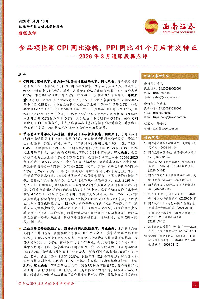 西南证券-2026年3月通胀数据点评:食品项拖累CPI同比涨幅,PPI同比41个月后首次转正-260410
