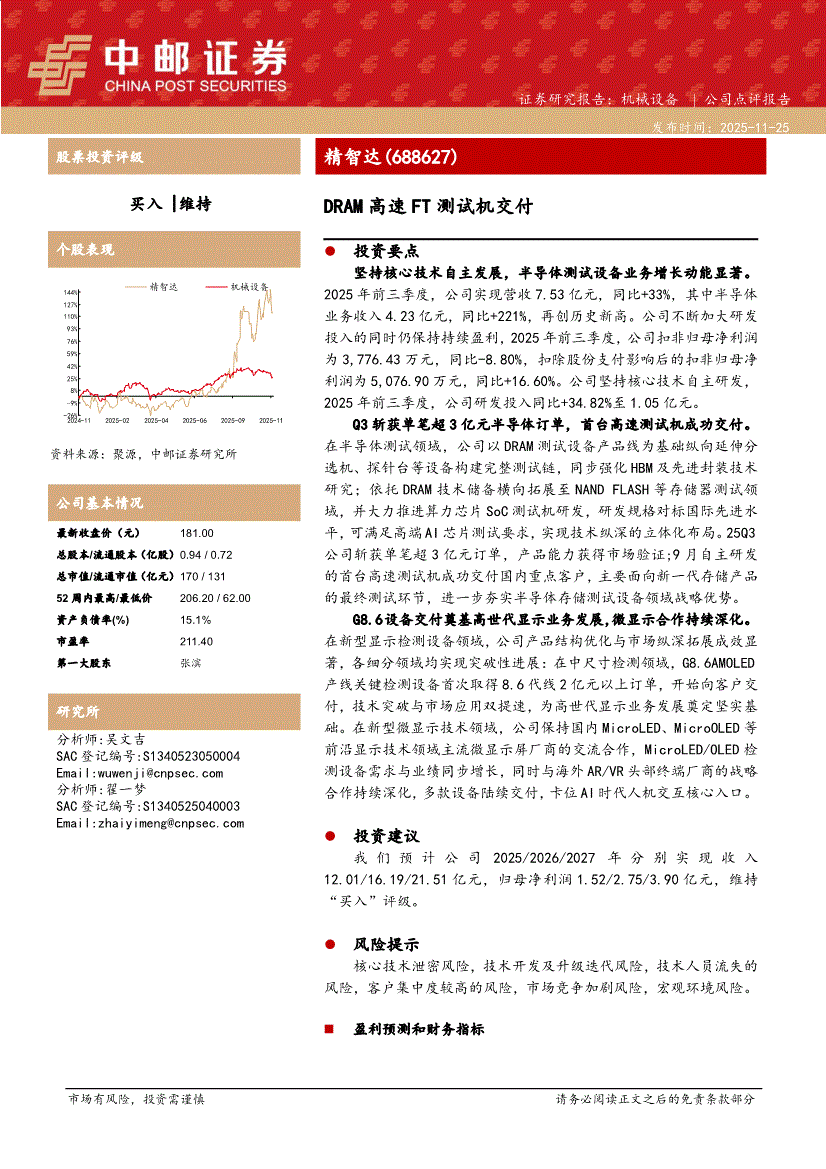精智达:中邮证券-精智达-688627-DRAM高速FT测试机交付-251125