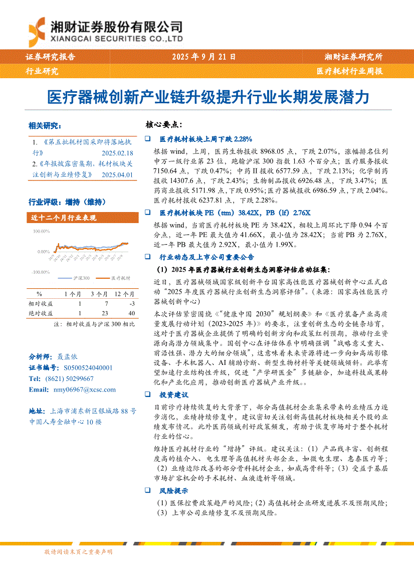 医疗耗材行业:湘财证券-医疗耗材行业周报:医疗器械创新产业链升级提升行业长期发展潜力-250921