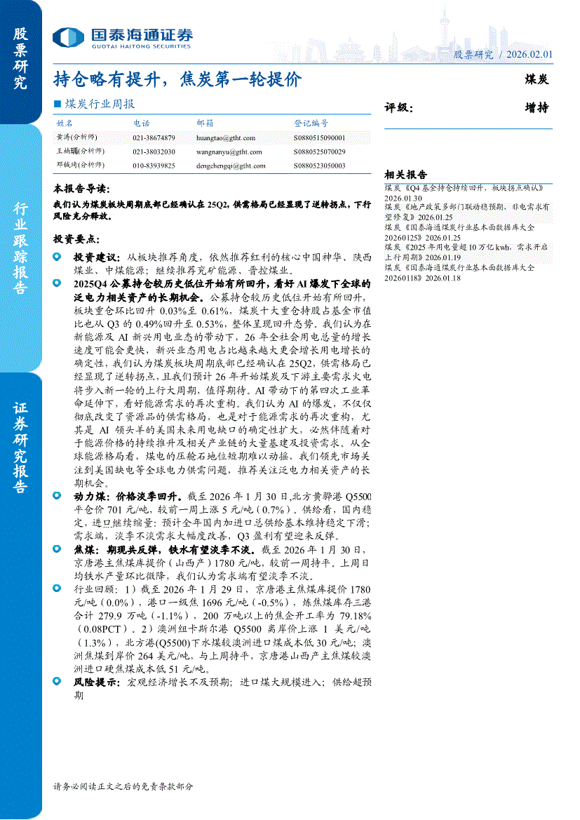 煤炭行业:国泰海通证券-煤炭行业周报:持仓略有提升,焦炭第一轮提价-260201