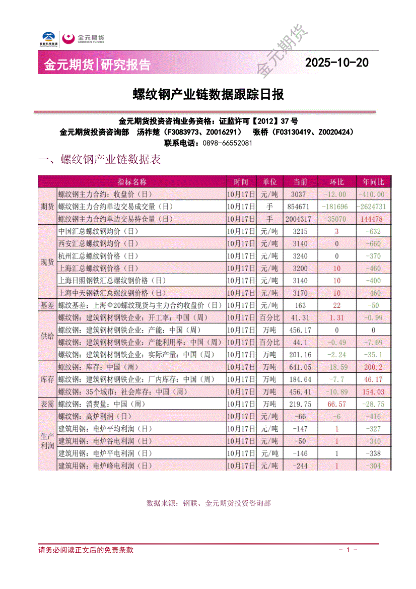 金元期货-螺纹钢产业链数据跟踪日报-251020