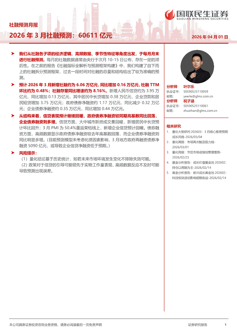 国联民生证券-社融预测月报:2026年3月社融预测,60611亿元-260401