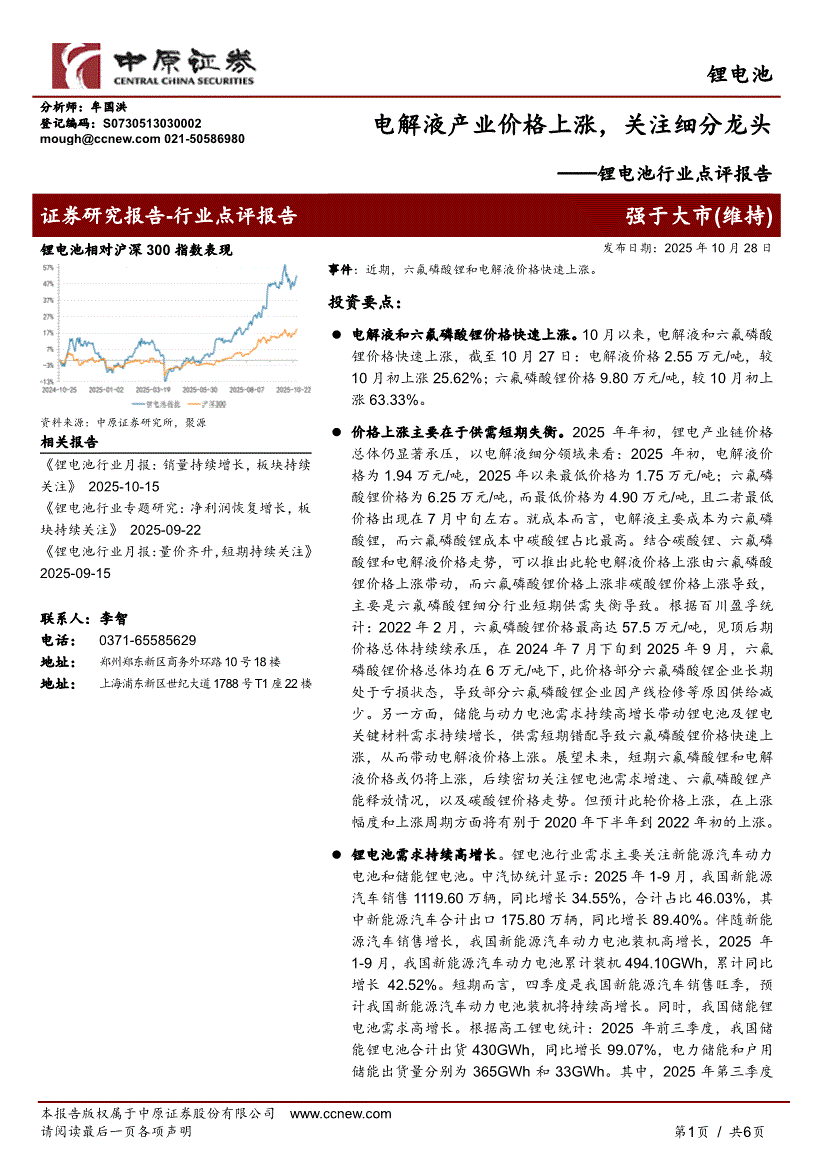 锂电池行业:中原证券-锂电池行业点评报告:电解液产业价格上涨,关注细分龙头-251028