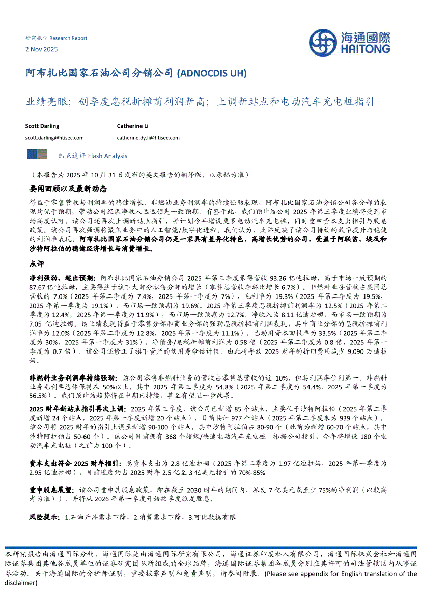 石油化工行业:海通国际-石油化工行业:阿布扎比国家石油公司分销公司(ADNOCDIS.UH)业绩亮眼;创季度息税折摊前利润新高;上调新站点和电动汽车充电桩指引-251102
