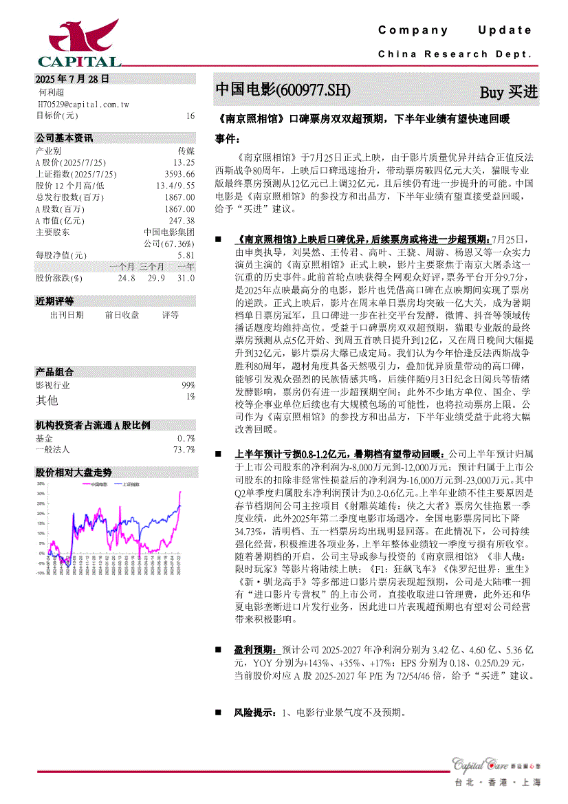 中国电影:群益证券-中国电影-600977-《南京照相馆》口碑票房双双超预期,下半年业绩有望快速回暖 -250728