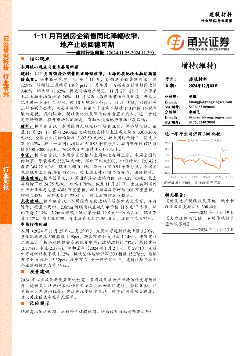 建材行业:甬兴证券-建材行业周报:1~11月百强房企销售同比降幅收窄,地产止跌回稳可期-241203