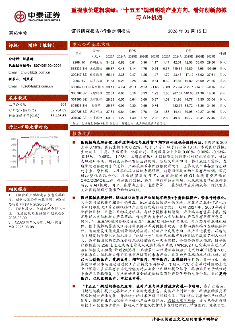 医药生物行业:中泰证券-医药生物行业:重视涨价逻辑演绎;“十五五”规划明确产业方向,看好创新药械与AI+机遇-260315