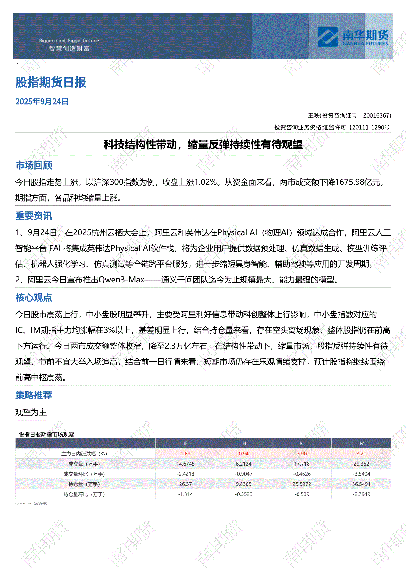 南华期货-股指期货日报:科技结构性带动,缩量反弹持续性有待观望-250924