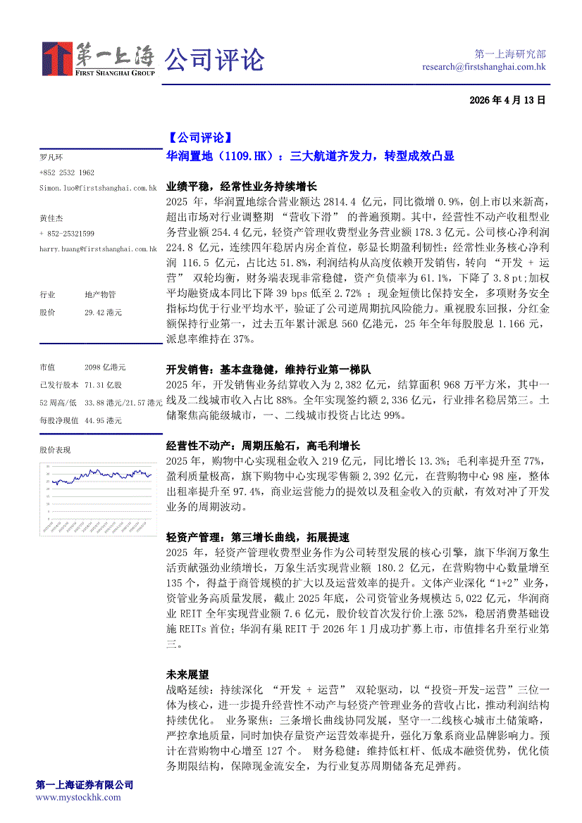 华润置地:第一上海-华润置地-1109.HK-三大航道齐发力,转型成效凸显-260413