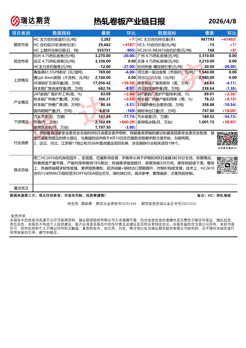 瑞达期货-热轧卷板产业链日报-260408